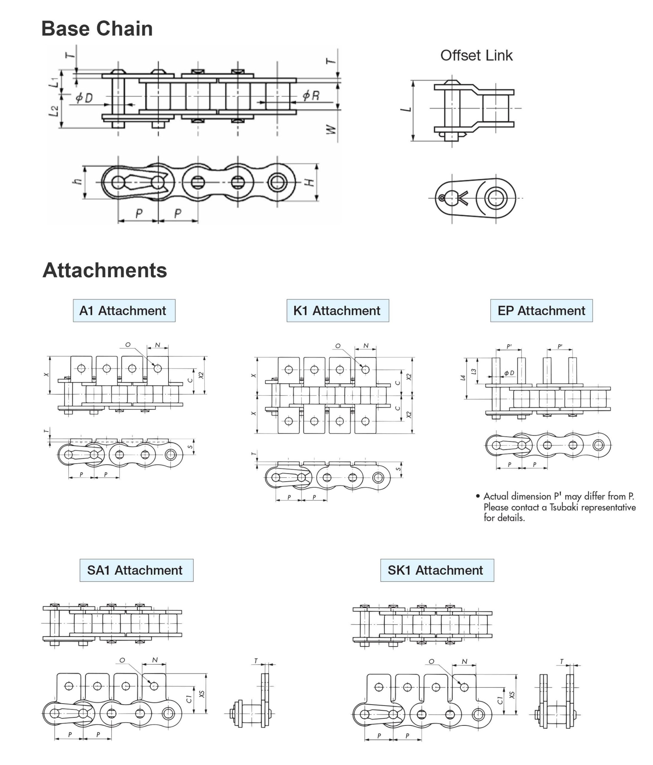 | Tsubaki Chain No. | Attachment Dimensions | |||||||||
