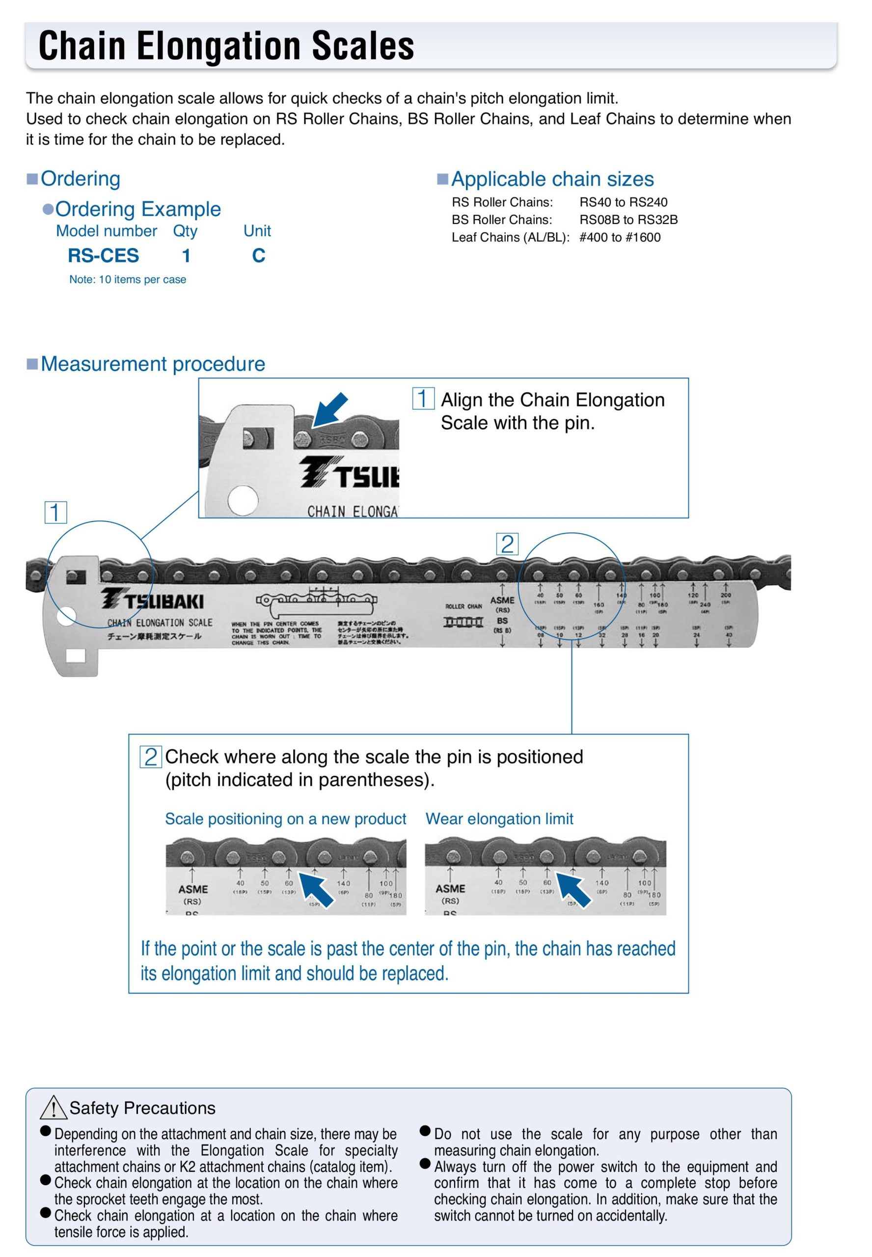 - ไม้บรรทัดวัดความยืดของโซ่ใช้ตรวจเช็คขีดจำกัดความยืดของระยะพิตช์ของโซ่ได้อย่างรวดเร็ว ใช้ในการตรวจเช็คความยืดของโซ่ลูกกลิ้ง RS, โซ่ลูกกลิ้ง BS และโซ่ยกเพื่อประเมินว่าถึงเวลาต้องเปลี่ยนโซ่ใหม่เมื่อใด